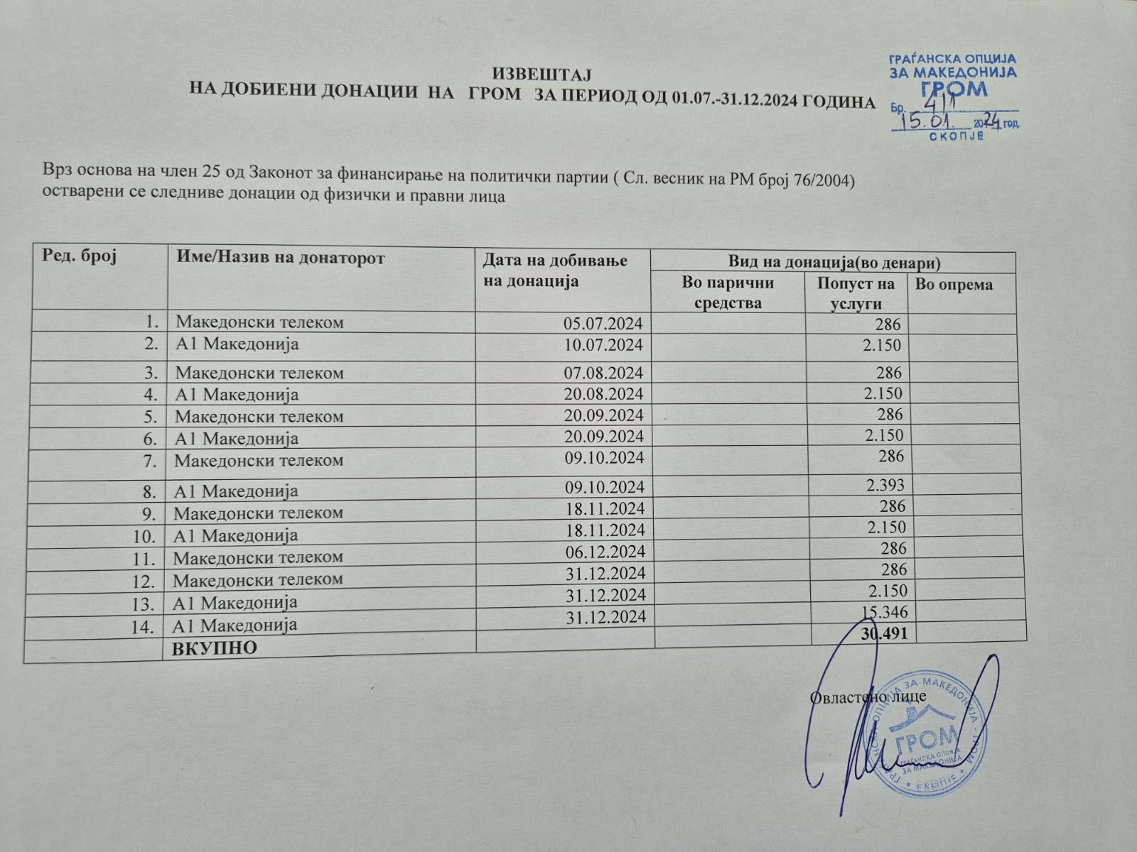 Извештај за добиени донации на ГРОМ за период од 01.07.-31.12.2024 година
