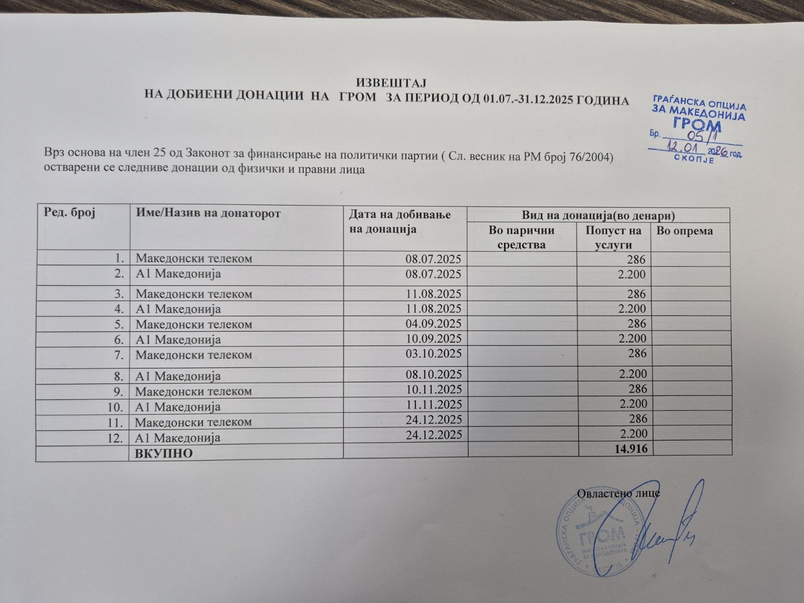 Извештај за добиени донации на ГРОМ за период 01.07-31.12.2025 година Споделете го линкот на социјалните мрежиFacebookGoogleTwitterLinkedin